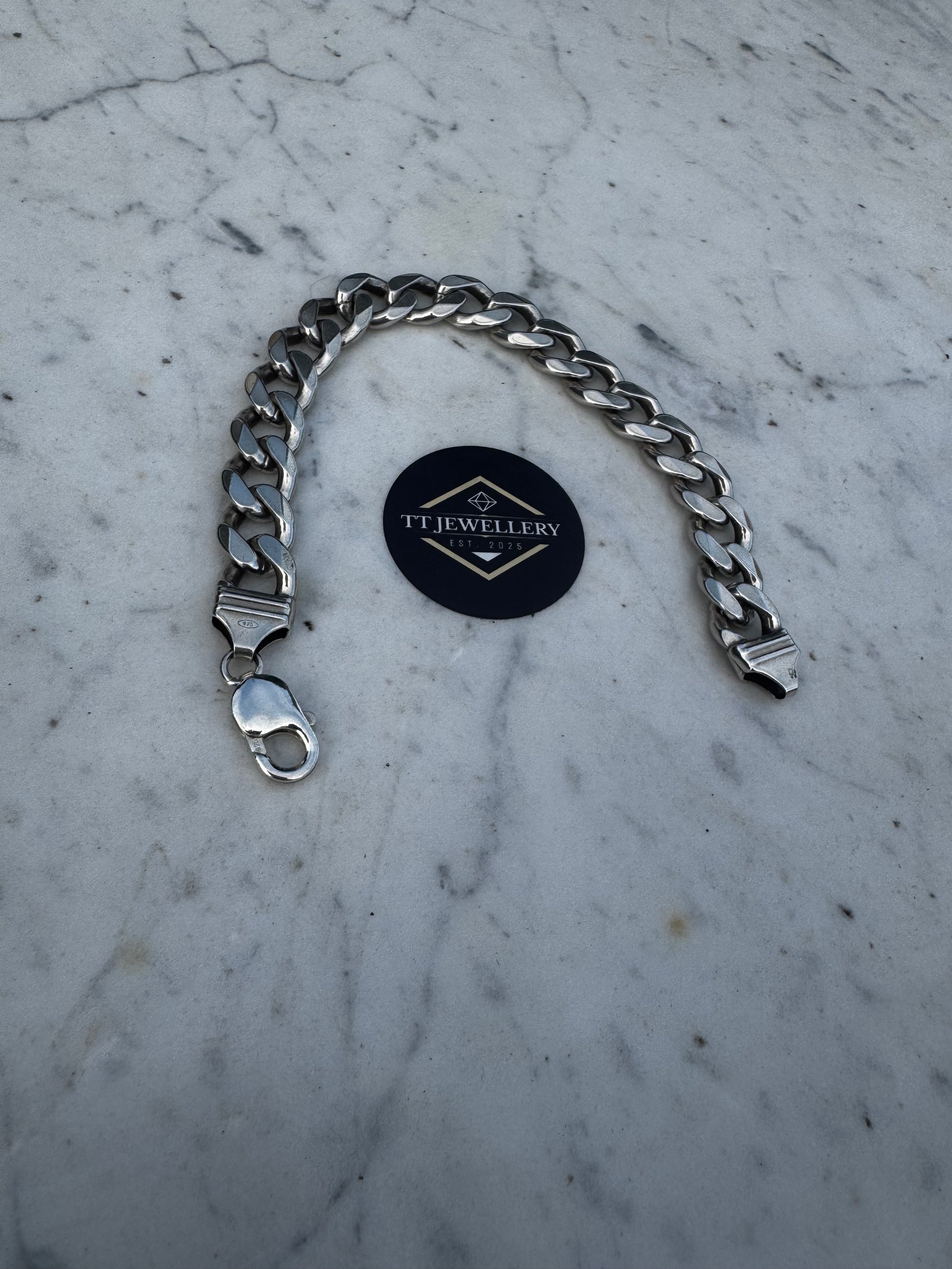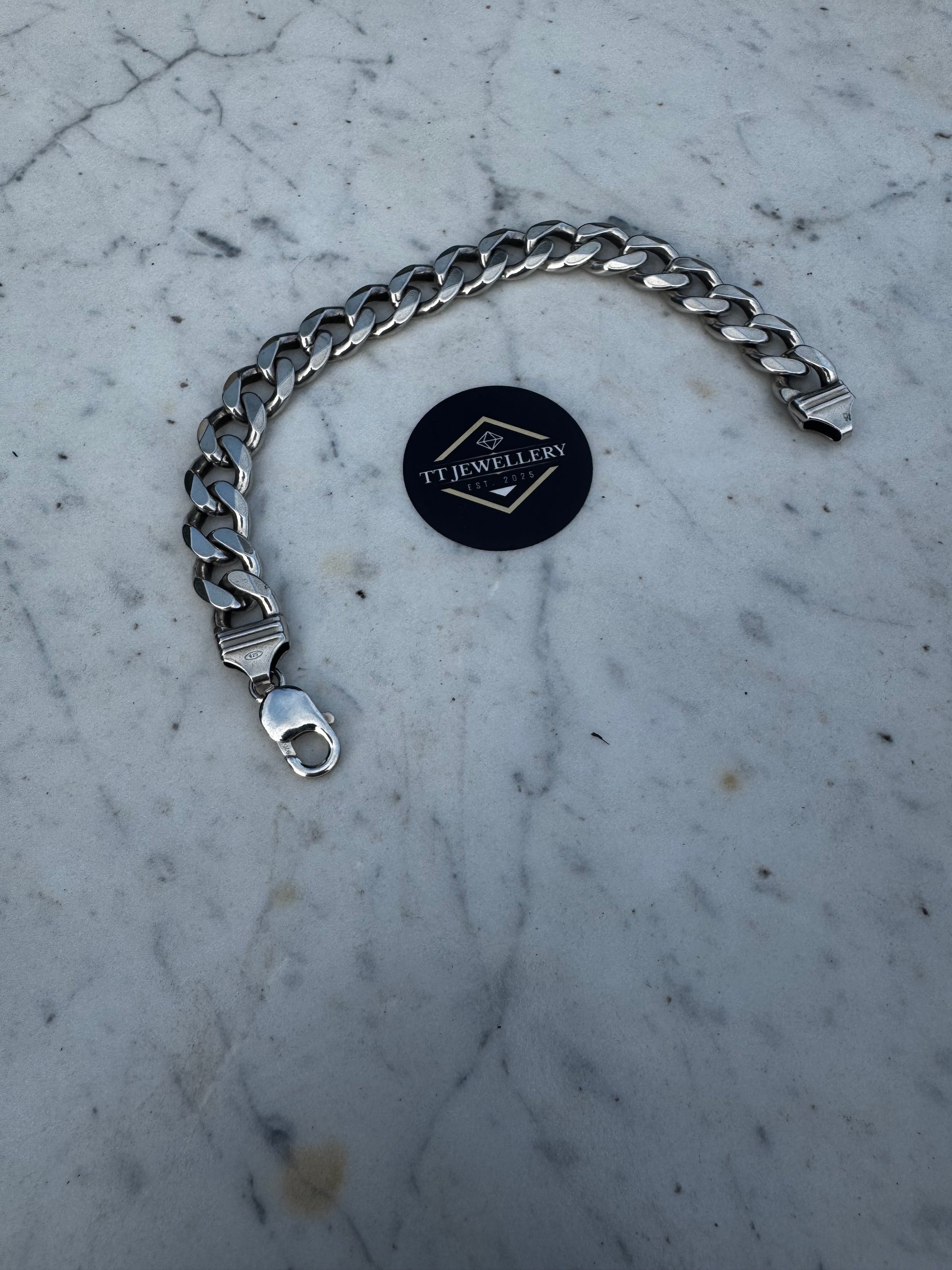 This silver curb bracelet, weighing 61.1 grams and measuring 9.5 inches in length, offers a substantial and durable accessory for everyday wear. Crafted with precision, its classic curb link design ensures both strength and flexibility, making it a timeless piece suitable for layering or standalone elegance. Ideal for those seeking a high-quality silver bracelet with expert craftsmanship.