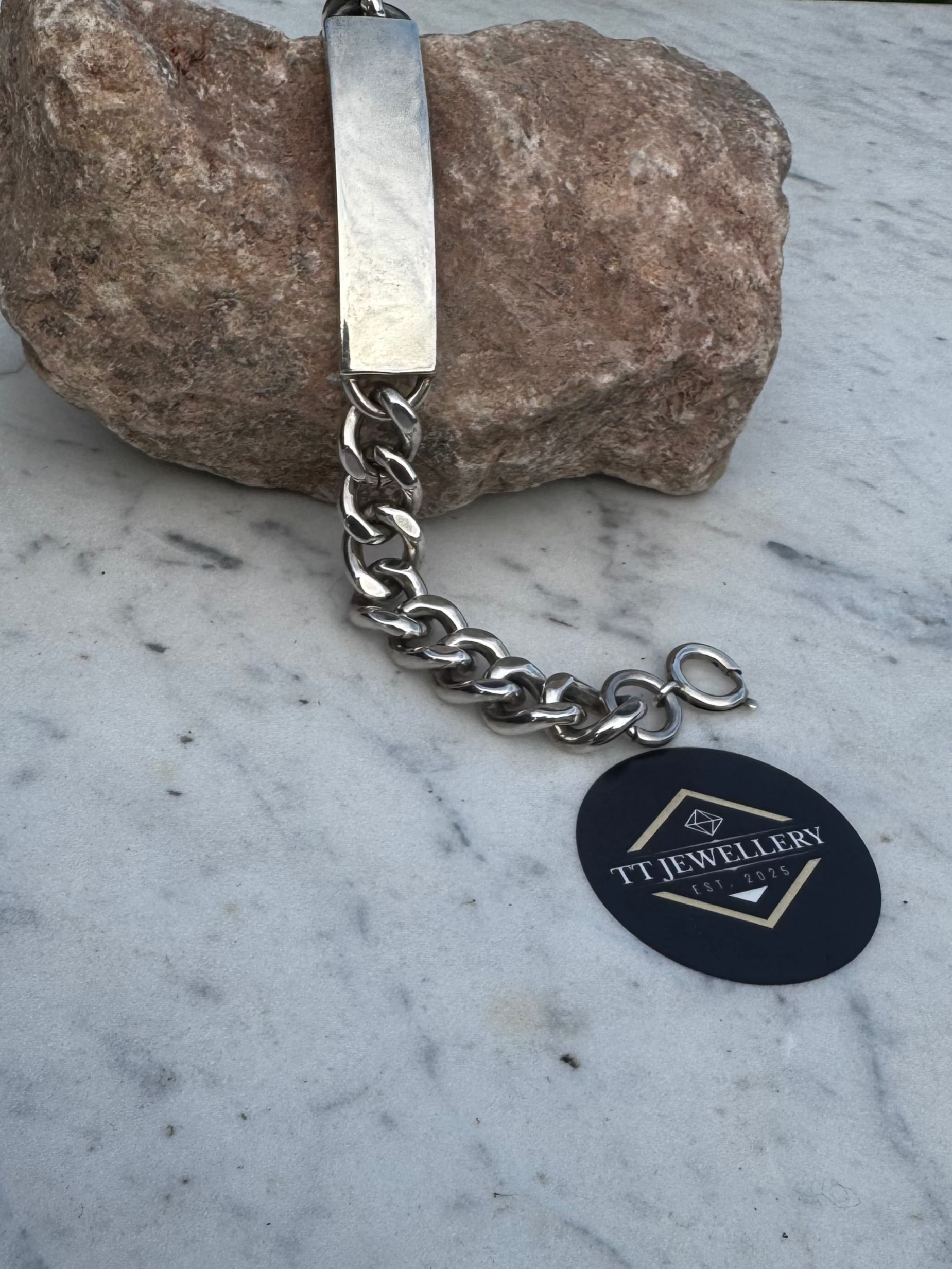 This expertly crafted silver ID bracelet weighs 60.2 grams and measures 8 inches in length, offering a substantial yet comfortable fit. Its durable sterling silver construction ensures lasting quality, while the classic ID plate design provides a timeless style suitable for everyday wear or special occasions. Ideal for personalization, this bracelet combines elegance with practicality for a distinguished accessory.